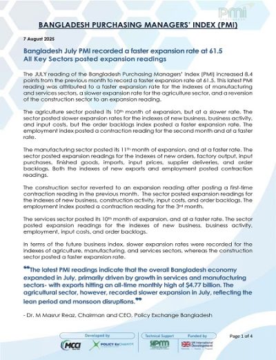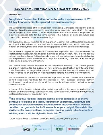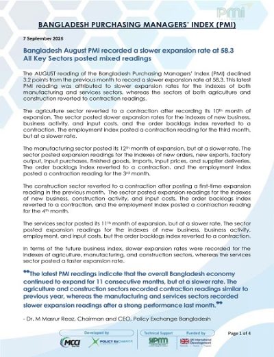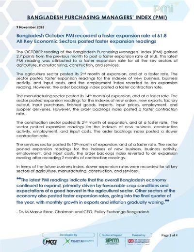Bangladesh Purchasing Managers’ Index (PMI)pranay2024-05-21T12:46:42+06:00 Bangladesh Purchasing Managers’ Index (PMI) BANGLADESH PMI OCTOBER 2025 VIEW Bangladesh PMI September 2025 VIEW BANGLADESH PMI AUGUST 2025 VIEW BANGLADESH PMI JULY 2025 VIEW BANGLADESH PMI JUNE 2025 VIEW BANGLADESH PMI MAY 2025 VIEW BANGLADESH PMI APRIL 2025 VIEW BANGLADESH PMI MARCH 2025 VIEW BANGLADESH PMI FEBRUARY 2025 VIEW BANGLADESH PMI JANUARY 2025 VIEW BANGLADESH PMI DECEMBER 2024 VIEW BANGLADESH PMI NOVEMBER 2024 VIEW 1 2 »