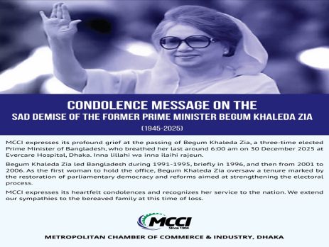 MCCI expresses its profound grief at the passing of Begum Khaleda Zia, a three-time elected Prime Minister of Bangladesh, who breathed her last around 6 am on 30 December 2025 at Evercare Hospital, Dhaka. Inna lillahi wa inna ilaihi rajeun.