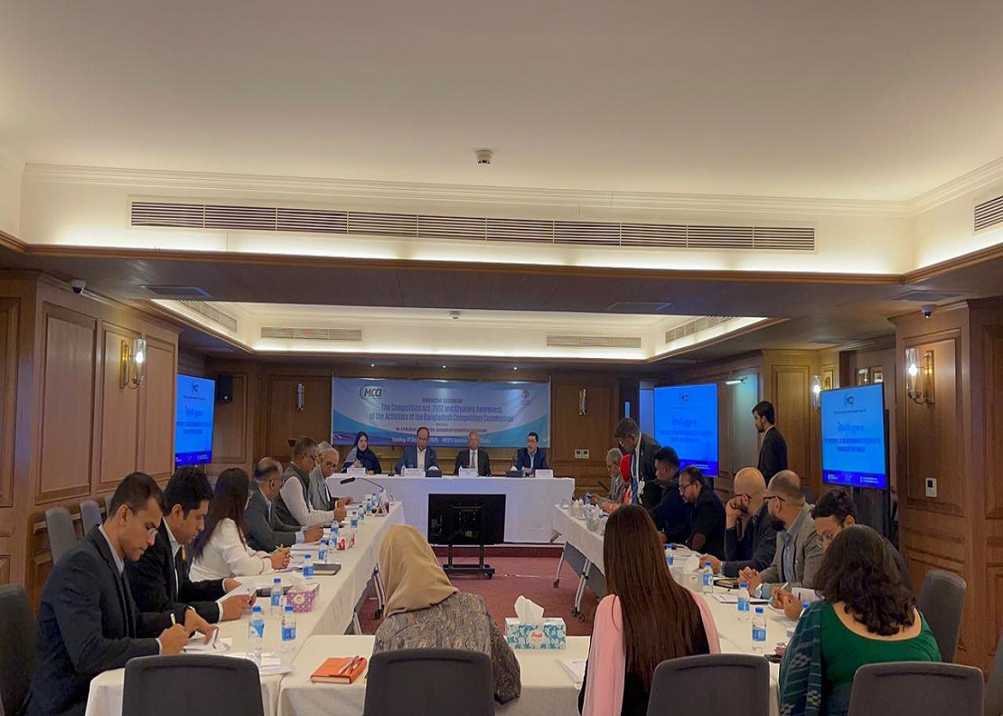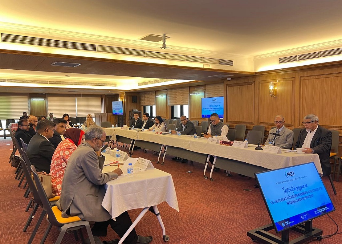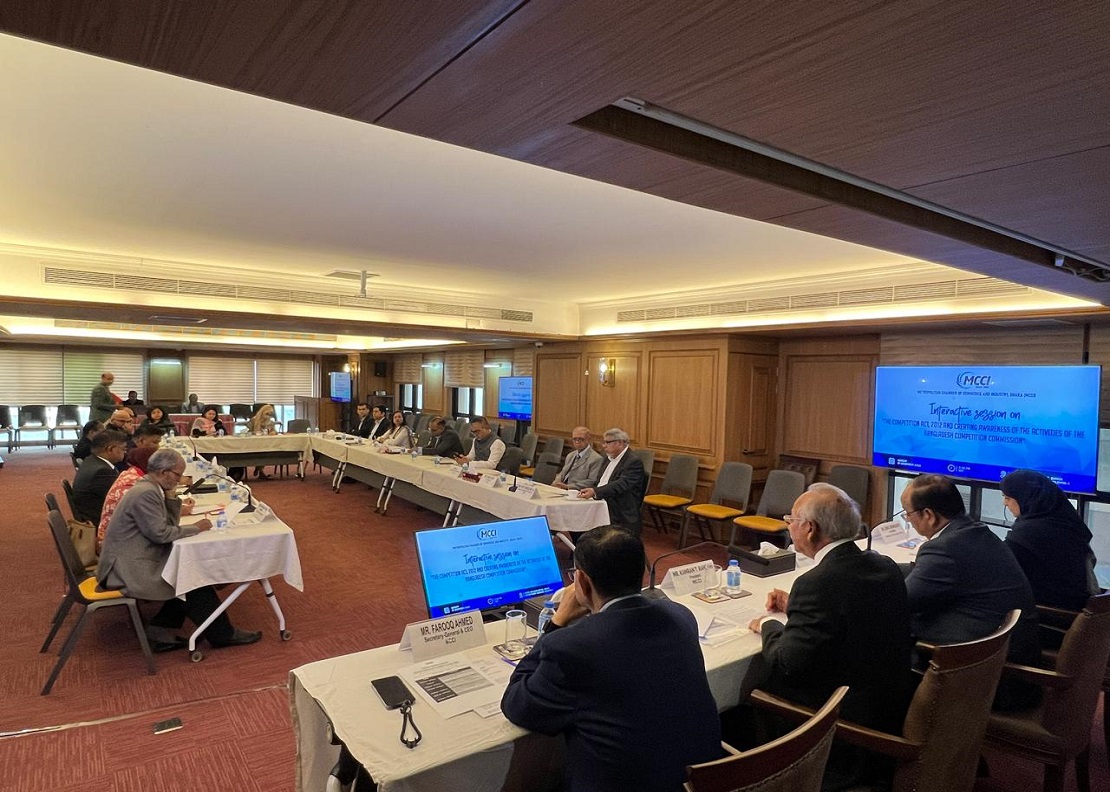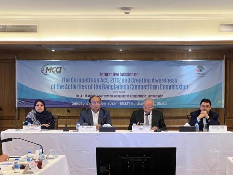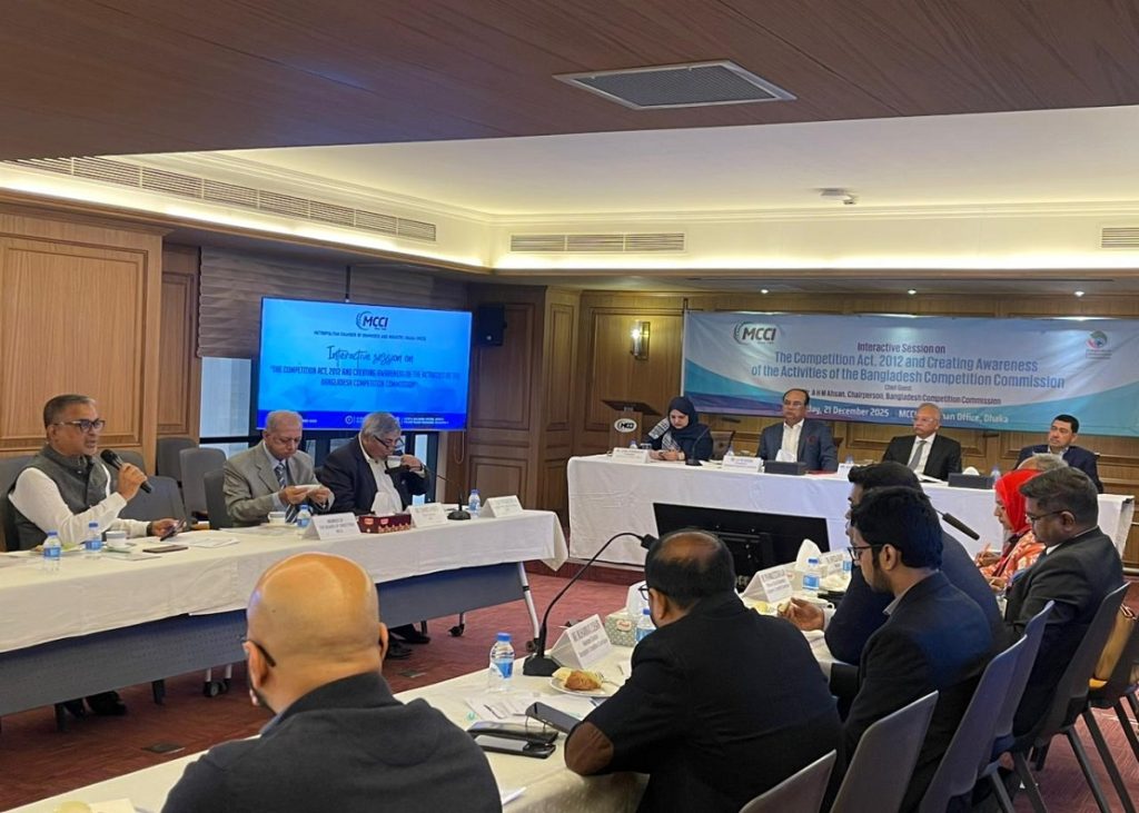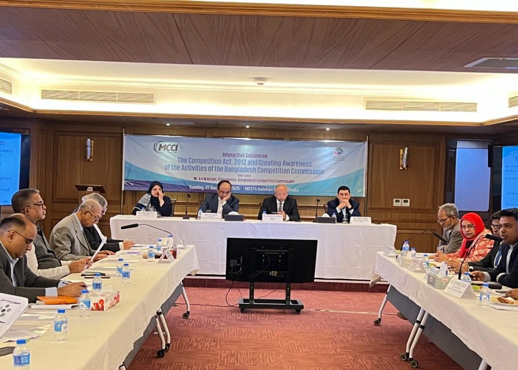 On 21 December 2025, the Metropolitan Chamber of Commerce and Industry, Dhaka (MCCI), hosted a delegation from the Bangladesh Competition Commission at its Gulshan office. Chaired by the MCCI President, Mr. Kamran T. Rahman, a discussion session titled “The Competition Act, 2012 and Creating Awareness of the Activities of the Bangladesh Competition Commission” took place. The session aimed to enhance participants’ understanding of the Competition Act, 2012, and provide insights into the mandate, functions, and ongoing activities of the Bangladesh Competition Commission. The visiting delegation was headed by Mr. A. H. M. Ahsan, Chairperson, Bangladesh Competition Commission. Mr. Farooq Ahmed, Secretary-General and CEO, and representatives from MCCI member firms were also present during the event.